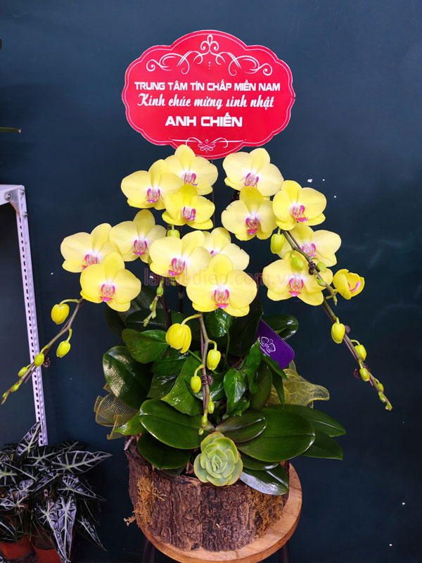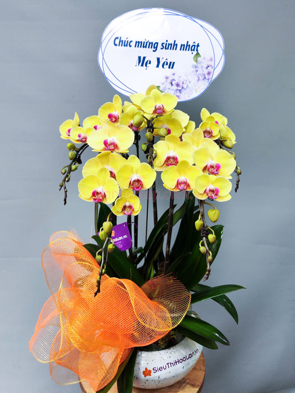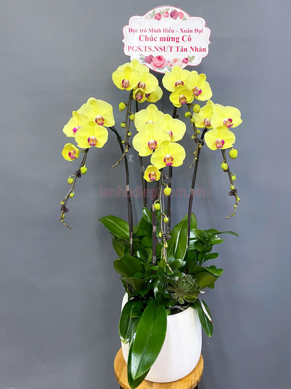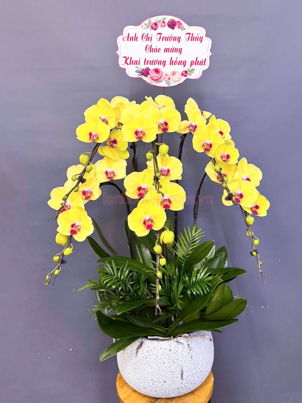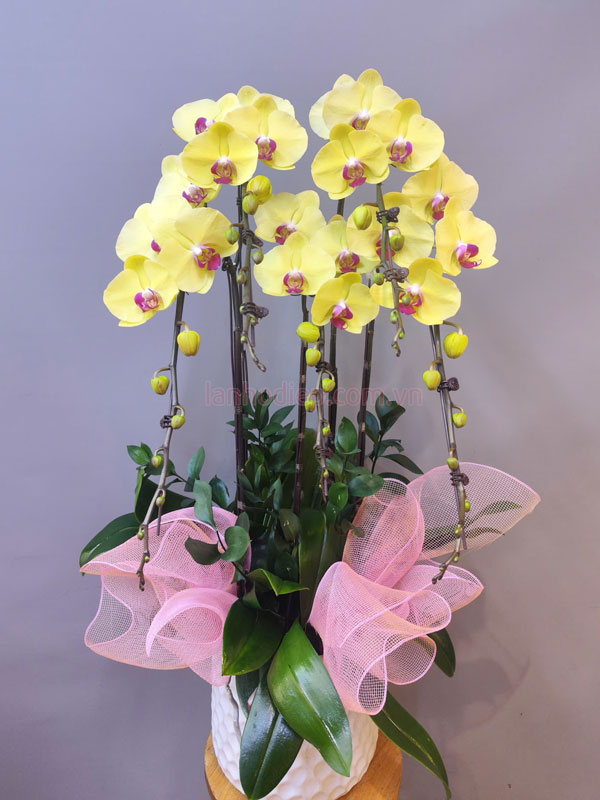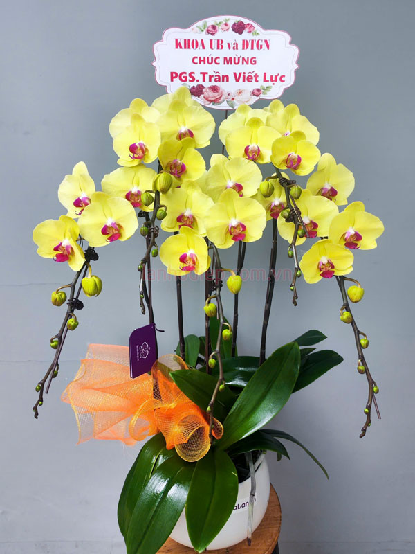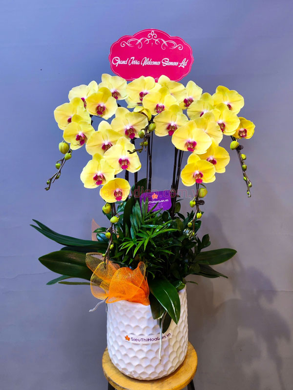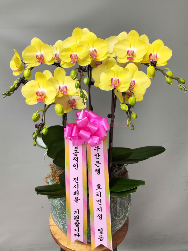 Giá chậu lan hồ điệp vàng 5 cành chưa bao gồm 10% thuế VAT (xuất hóa đơn điện tử), free ship nội thành, miễn phí in thiệp banner theo yêu cầu.